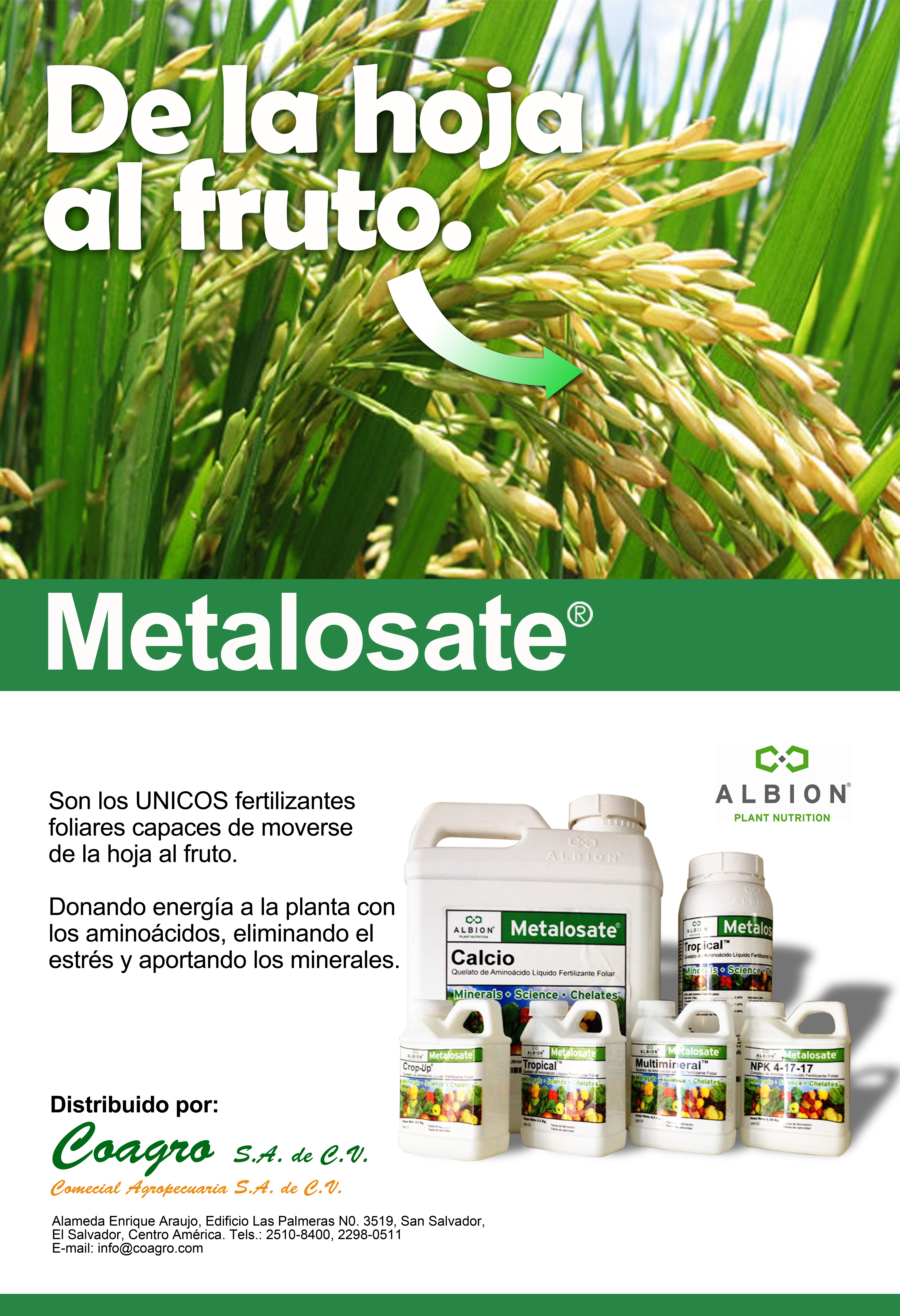 Afiche con el lema «de la hoja al fruto» para el cultivo de arroz. Elaborado inicialmente para El Salvador.