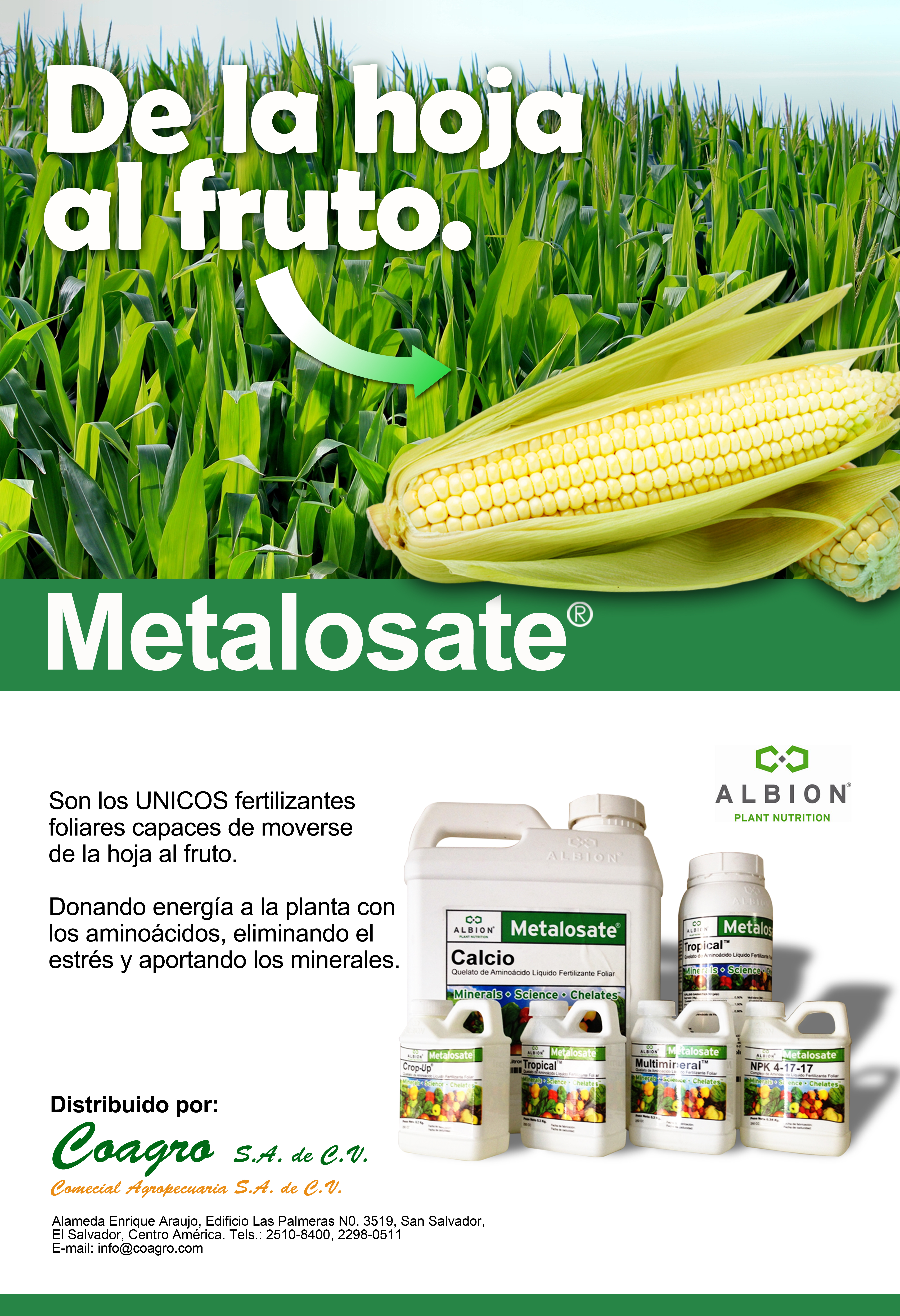 Afiche con el lema «de la hoja al fruto» para el cultivo de maíz. Elaborado inicialmente para El Salvador.