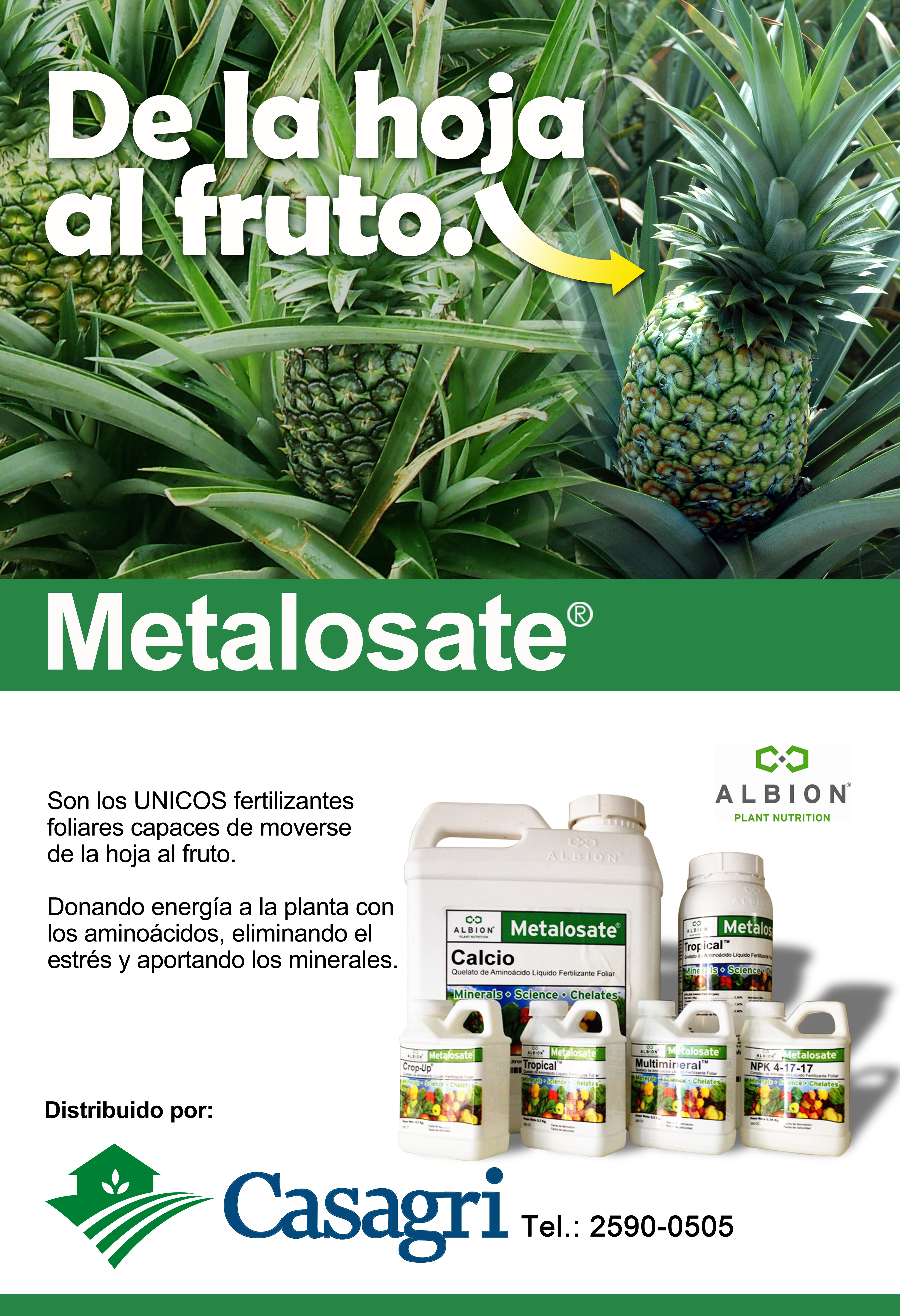 Afiche con el lema «de la hoja al fruto» para el cultivo de piña. Elaborado inicialmente para Costa Rica.